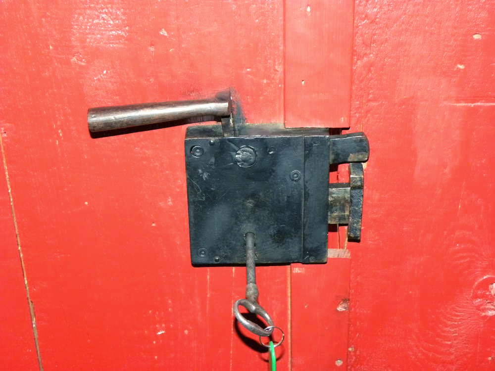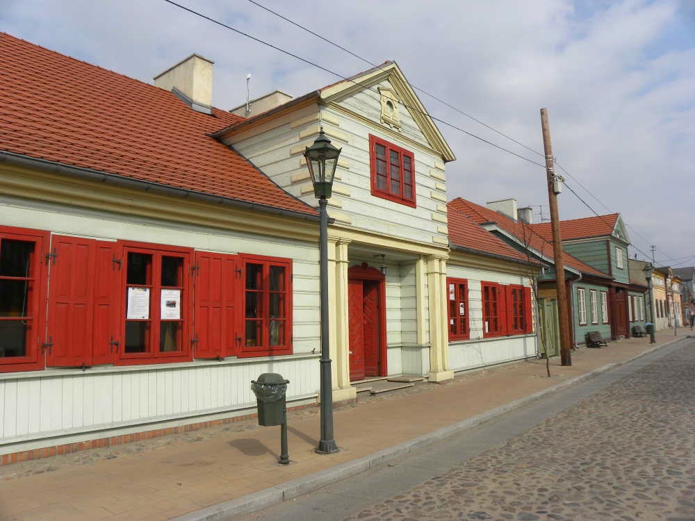 Fragment okna - piękna drewniana stolarka (w oknie zawieszony plakat informujący o trwającej wystawie ceramiki artystycznej)