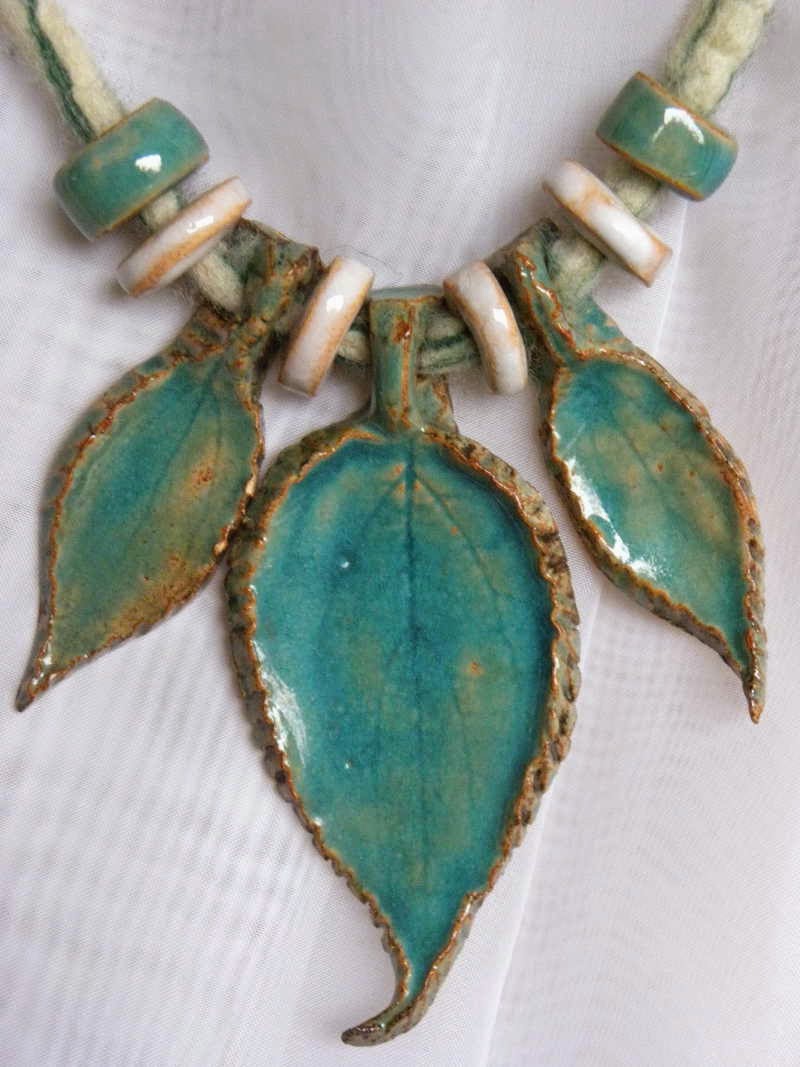 - ulepioną przeze mnie biżuterię glinianą (glina z zawartością drobnego szamotu) szkliwioną brązem i zielenią antyczną (stylizacja jesienna) oraz bielą i turkusem krakle (stylizacja zimowa), Elementy gliniane zawieszone na ufilcowanych wełnianych dredach;