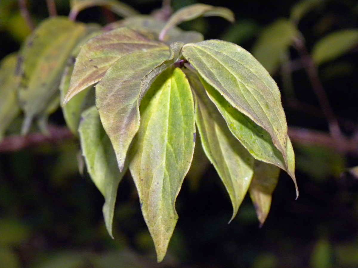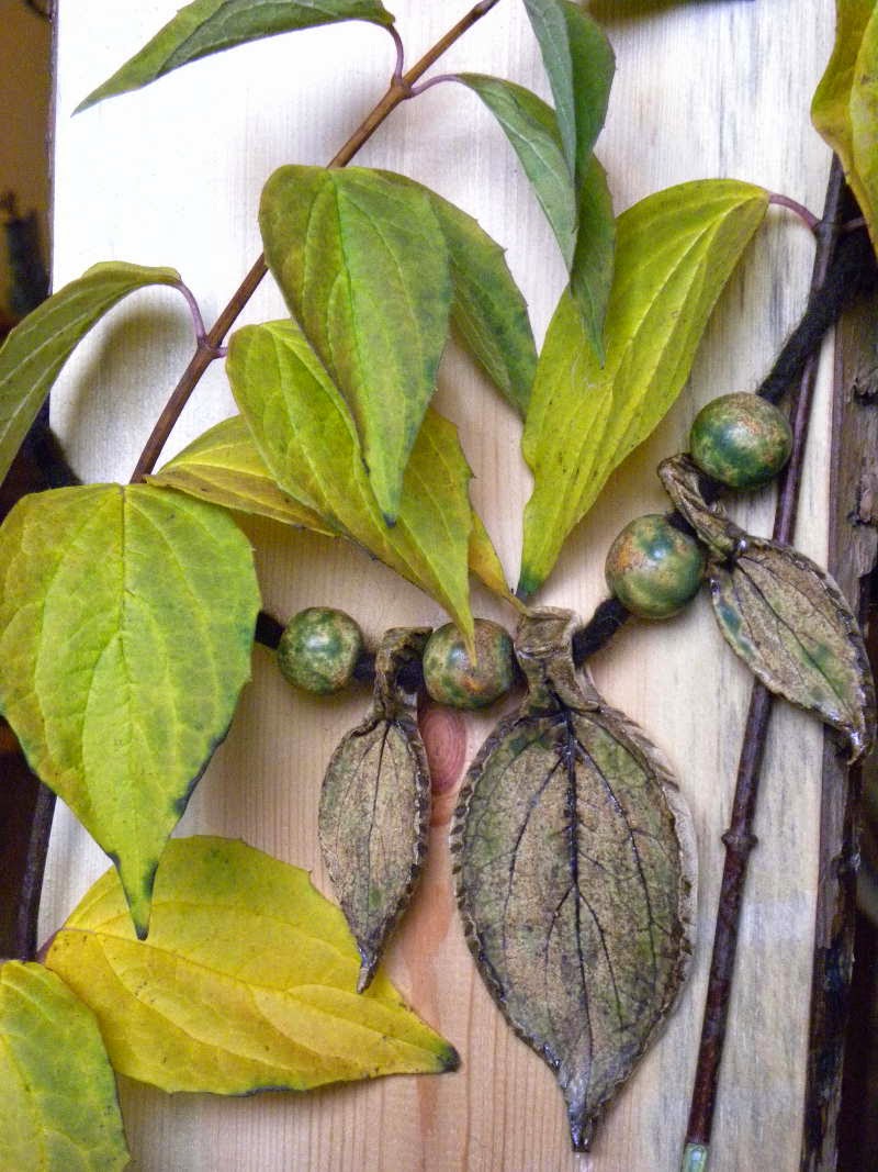 Gliniany naszyjnik z motywem liści jaśminu w jesiennych barwach. Na tle białej bluzki. Klimat zdjęcia nawiązuje do mglistych, pochmurnych jesiennych dni. Romantycznie i nostalgicznie.